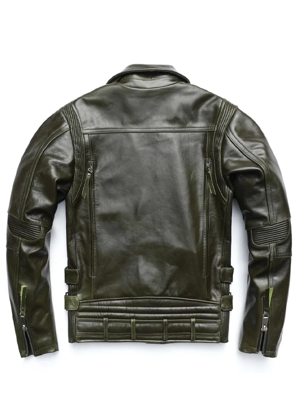 The bold army green color sets this jacket apart from standard black or brown leather, giving it a rugged, military-inspired edge. This unique tone makes it a versatile outerwear choice for both motorcycle rides and casual daywear.